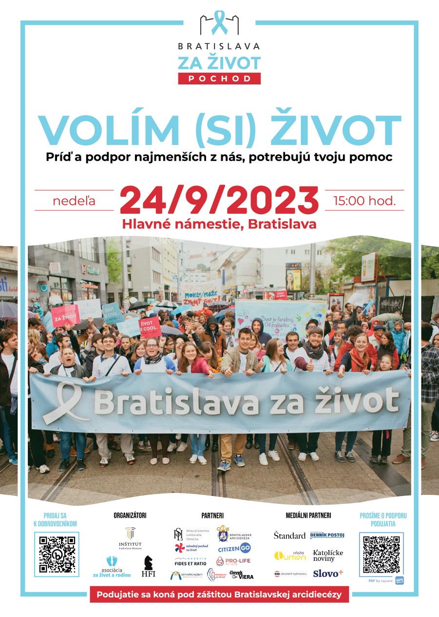 Bratislava opäť zažiari radosťou zo života, ktorý je potrebné chrániť od jeho vzniku, - od počatia, po prirodzenú smrť. Áno, dnes viac ako kedykoľvek predtým je nevyhnutné, aby naša spoločnosť vyjadrila, že stojíme pri tých najmenších z nás, a že chceme aby bol ľudský život chránený. Príď aj ty vyjadriť svoju túžbu, po zmene v našich zákonoch. príď...