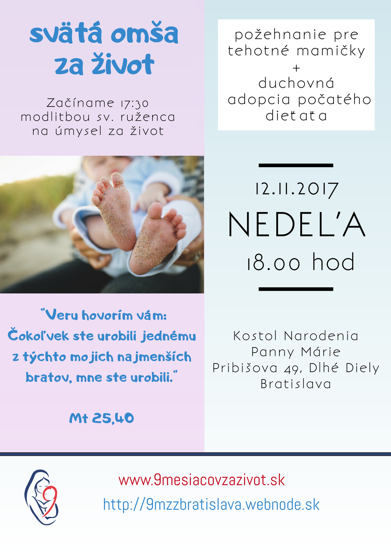 Pred svätou omšou (cca od 17:30) sa budeme modliť svätý ruženec s pro - life zamysleniami. Každý, kto sa môžte prísť predmodlievať, je očakávaný.